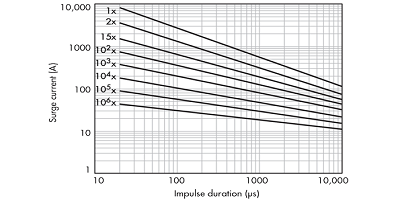 2. MOV的數(shù)據(jù)表將提供脈沖速率曲線;此示例適用于20毫米MOV。