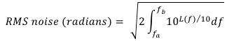 可以使用以下公式根據(jù)RMS相位抖動(dòng)值來量化可接受的相位噪聲電平。請注意,Lf)是對(duì)數(shù)相位噪聲數(shù)據(jù),因此10的奇數(shù)因子出現(xiàn)在積分中,以將其轉(zhuǎn)換回線性數(shù)據(jù)集。此處的積分取自相關(guān)信號(hào)范圍。