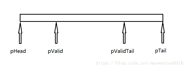 4、pValidTail 是使用區(qū)域的的結(jié)尾指針,存數(shù)據(jù)時(shí)的起點(diǎn),當(dāng)存數(shù)據(jù)時(shí),pValidTail要發(fā)生偏移