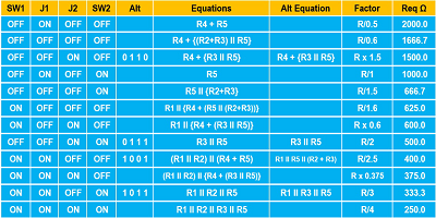 通過四個(gè)開關(guān),可以進(jìn)行16種開關(guān)設(shè)置組合。使用12個(gè)開關(guān)設(shè)置,eq12個(gè)不同的值。(剩余的四個(gè)開關(guān)設(shè)置會(huì)產(chǎn)生eq重復(fù)值;這些替代設(shè)置在標(biāo)有“ Alt”的列中捕獲。)在“ Equations”列中給出了計(jì)算12種不同組合的eq值的方程式,而“ Alt公式列列出了替代組合的公式。