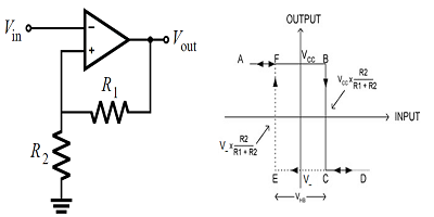 對(duì)于施密特觸發(fā)器,有意添加磁滯以將開(kāi)關(guān)閾值設(shè)置為某個(gè)所需值。對(duì)于基于晶體管的比較器,可以使用分壓器通過(guò)另一個(gè)正反饋環(huán)路將滯后作用于輸出電壓。分壓器中的電阻值決定了磁滯窗口的大小和輸出波形的占空比。反向施密特觸發(fā)器的通用電路如下所示,該電路包括輸出信號(hào)上的磁滯窗口。
