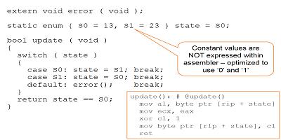編譯器還決定,由于實(shí)際對(duì)象(1323)的值未在數(shù)字上下文中使用,因此它將僅使用01的值在狀態(tài)之間切換,然后使用異或更新狀態(tài)值。二進(jìn)制文件遵循好像義務(wù),并且代碼快速緊湊。在其職權(quán)范圍內(nèi),編譯器做得很好。