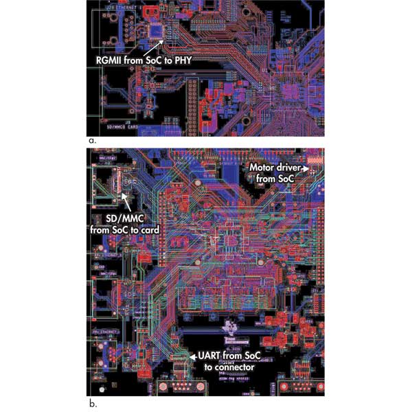 1. SoC連接來自同一組引腳的不同功能信號集的能力可能會在PCB布局上產生很大差異。這些布局顯示了同一SoC的兩種不同實現(xiàn)之間布線差異的示例。在第一個示例中,引腳用于UART,SD / MMC卡,GPIO和電機控制。在第二個示例中,相同的引腳用于RGMII以太網PHY連接。